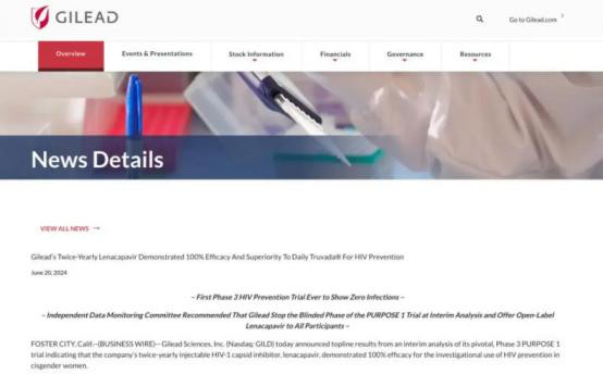 6月20日,美国生物制药公司吉利德公告称,其艾滋病预防药物lenacapavir在女性艾滋病暴露前预防第三期临床试验中实现100%有效。其中,2134名女性使用该药物后,无一感染艾滋病。这是有史以来首个零感染的3期HIV预防试验。