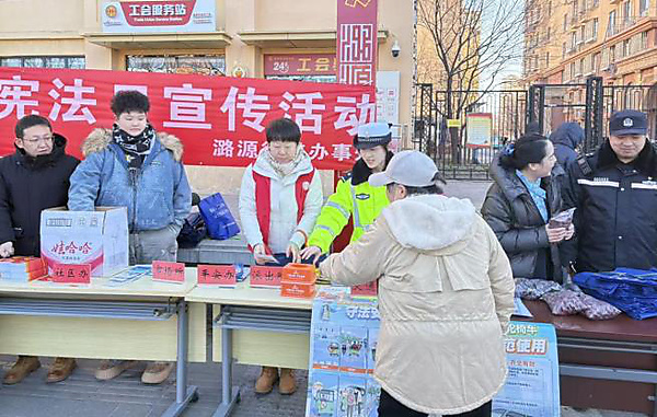 12月4日宪法宣传日当天,潞源街道联合潞源派出所、各居委会开展主题宣传活动。禁毒主管领导夏絮飞,街道及居委会相关负责人,派出所民警共同参与,将宪法宣传与冬季安全防护攻略有机结合,为居民送上“法治+安全”双重保障。