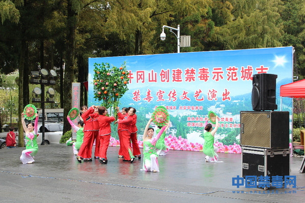 井冈山市乡土艺术文化团用形式多样的艺术形式结合禁毒常识开展禁毒宣传,乡土艺术文化团积极发挥文艺工作者和业余艺术团的自编自演能力,创编了音乐情景快板《远离毒品好处多》、小戏《铁窗泪》等文艺节目,并在演出中穿插禁毒小知识互动问答环节。