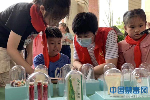 图为禁毒社工向学生展示毒品仿真模型。中国禁毒网发