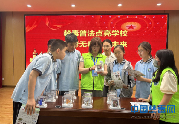 图为禁毒社工向学生讲解毒品仿真模型。中国禁毒网发