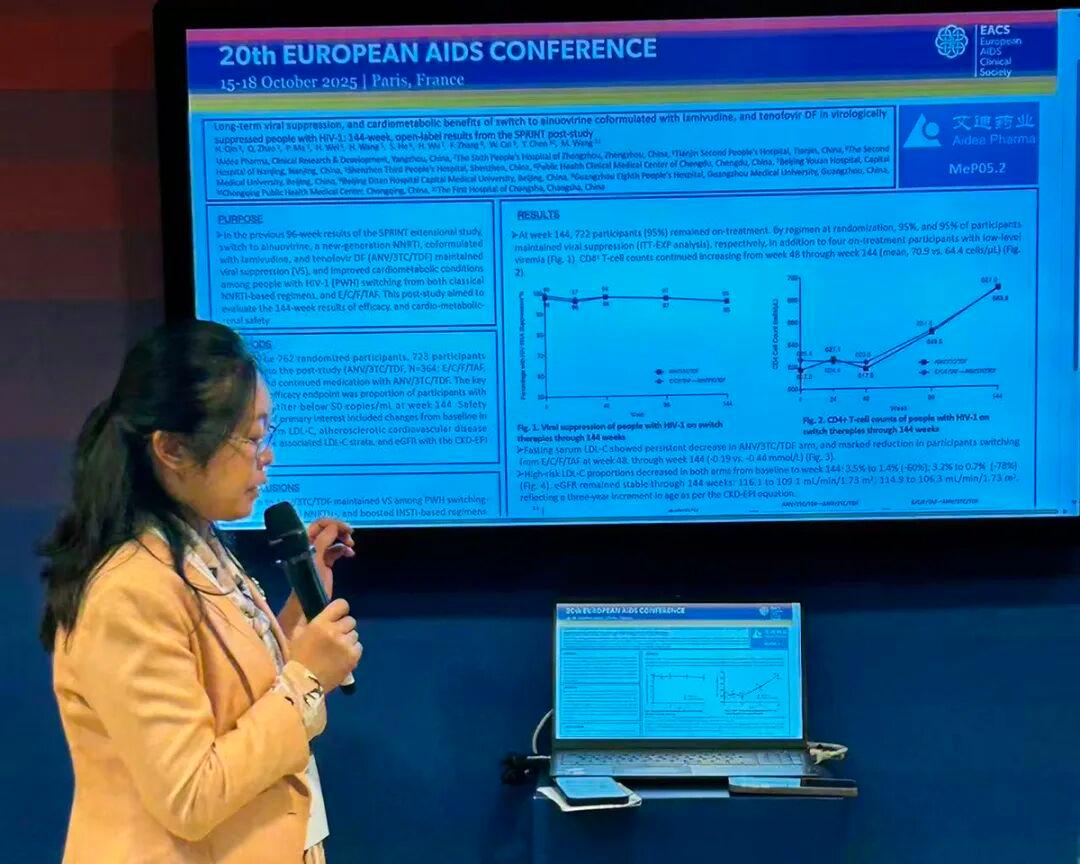 法国当地时间10月15日至18日,第20届欧洲艾滋病大会(EACS)在巴黎召开。本次大会的“永远的三合一”专题环节,广州医科大学附属市八医院李凌华教授应邀发表口头报告,系统介绍了艾迪药业(688488.SH)自主研发的首个创新抗艾单片复方制剂复邦德®(ALT)在转换治疗中的144周SPRINT研究结果。这是中国民族抗艾创新药首次在欧美主流HIV学术会议上实现专题口头报告。