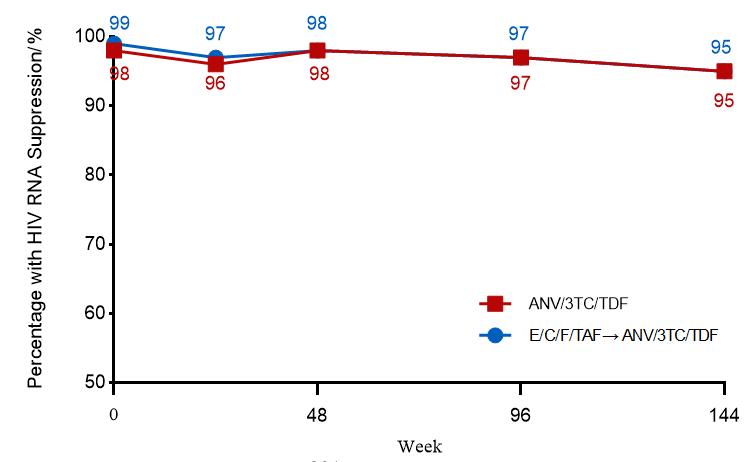 图2. HIV-1感染者转换治疗方案后144周内的病毒抑制情况