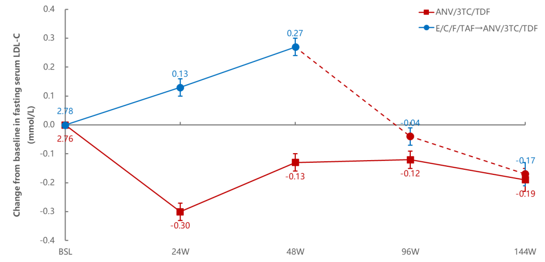 图3. 144周内空腹血清低密度脂蛋白胆固醇较基线的变化