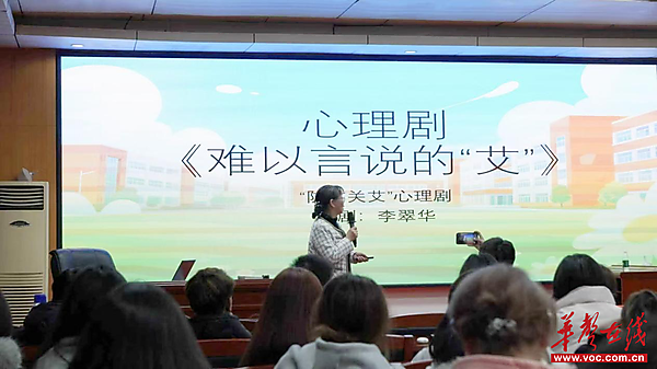 由娄底慈爱社会服务中心负责人、国家二级心理咨询师、性教育高级讲师李翠华自编自导的心理剧《难以言说的“艾”》缓缓拉开帷幕,生动再现了艾滋病感染者在身心双重困境中的挣扎与坚守。演员们全情投入的真挚演绎,将角色的痛苦、迷茫与重生诠释得淋漓尽致,报告厅内鸦雀无声,不少师生眼角泛红、潸然泪下。