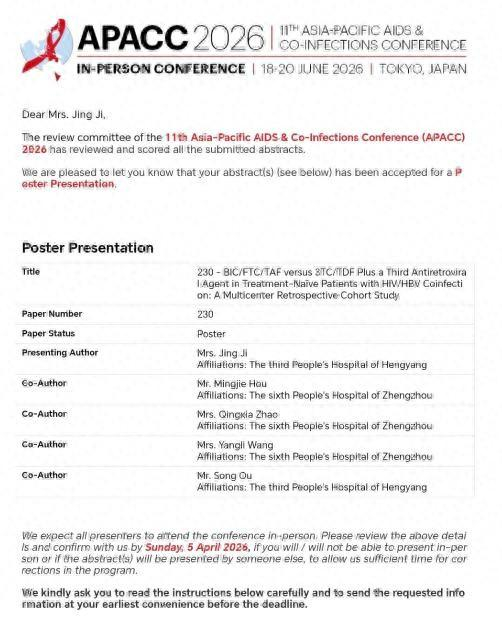 2026年3月26日,从亚太艾滋病与共感染会议(APACC)2026年度评审委员会传来喜讯,衡阳市第三人民医院吉婧医生撰写的学术论文《BIC/FTC/TAF versus 3TC/TDF plus a Third Antiretroviral Agent in Treatment-Naïve Patients with HIV/HBV Coinfection: AMulticenterRetrospective Cohort Study》正式获大会录用。这是继2024年、2025年之后,吉婧医生撰写的学术论文连续第三次入选APACC大会,充分彰显了该院艾滋病学科在科研领域的深厚积淀与持续创新能力。